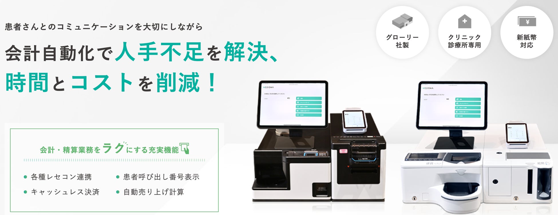 クリニックの会計・精算業務をサポートする「MEDIREGI」は、クリニック・診療所に特化して開発されたセミセルフレジ(自動釣銭機)です。